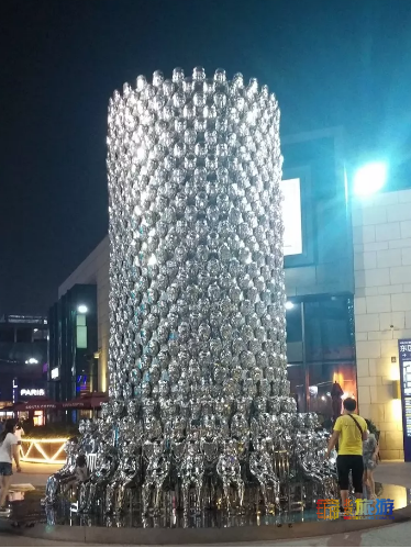 남입구 근처에서 회전하는 HI-UP 프로젝트의 불빛 아래, 아줌마들이 멋진 광장 춤을 추고 있다. 먼 곳의 조형은 게임기 조정기의 버튼 도안으로 되어 있으며, 이는 이곳이 놀기 좋은 곳이라는 점을 부각시키고 있다.