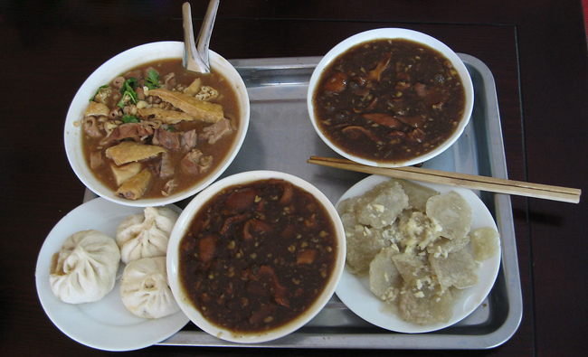 차오간(炒肝)은 베이징의 특색 전통음식의 하나로, 돼지 내장을 주 재료다. 탕즙은 윤기나는 진한 붉은 빛을 띠며, 묽은 듯 묽지 않는 특색을 가지고 있다. 돼지의 간과 대장 등을 주재료하고 마늘 등을 부재료로 하여, 전분을 풀어 넣어 약간 걸죽한 형태로 만든 간식이다.