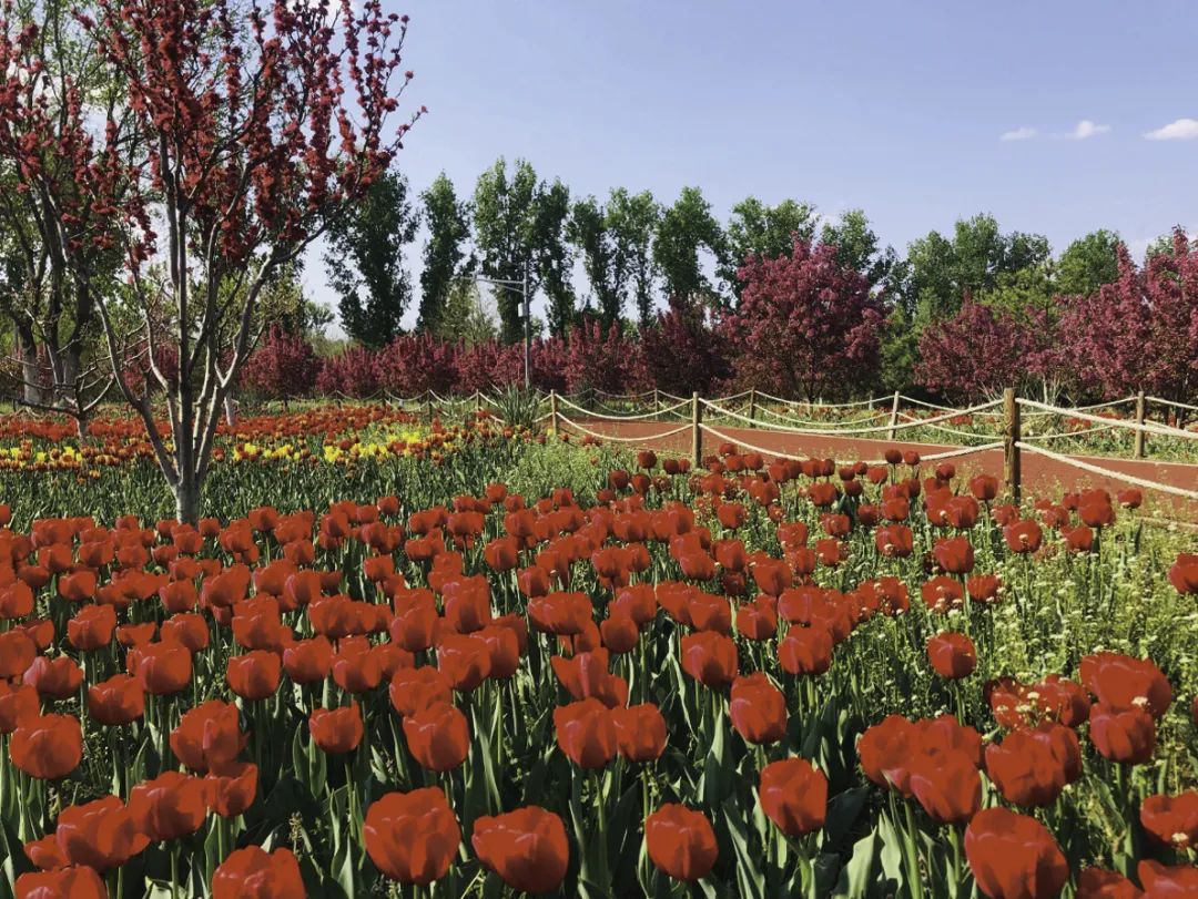 공원의 공간 배치는 "하나의 환, 두 개의 구역, 세 개의 정원"으로 구성되어 있으며, 한 개의 환은 13.8킬로미터 길이의 자전거 건강 산책로다. 두 개의 구역은 공원이 북부의 산림 보전 구역과 남부의 산림 운동 구역으로 나뉘며, 세 개의 정원은 40묘의 해당화원, 35묘의 튤립원, 그리고 15묘의 모란 작약원입니다.