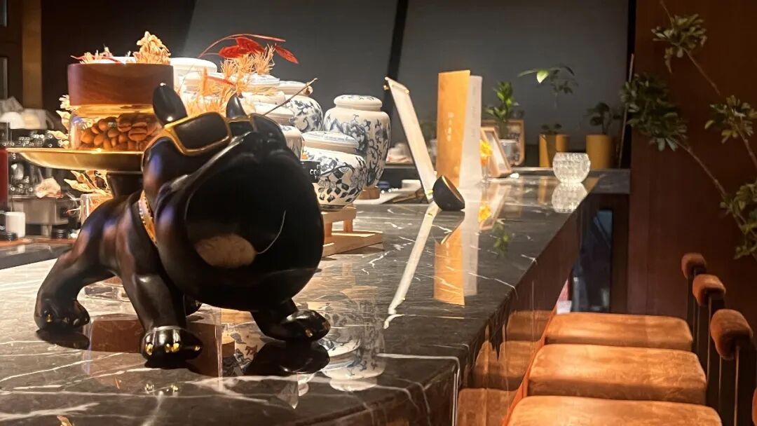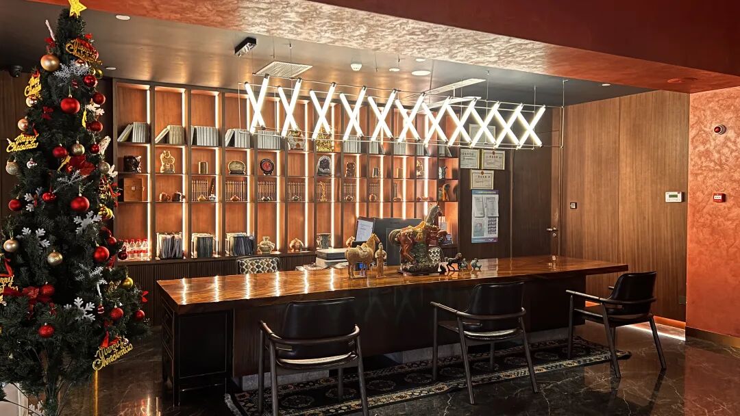 호텔 로비 한켠에 중국식 인테리어 디테일을 보여주며, 빛이 부드럽고 "고전과 현대가 교차하는" 조성이 돋보인다.
