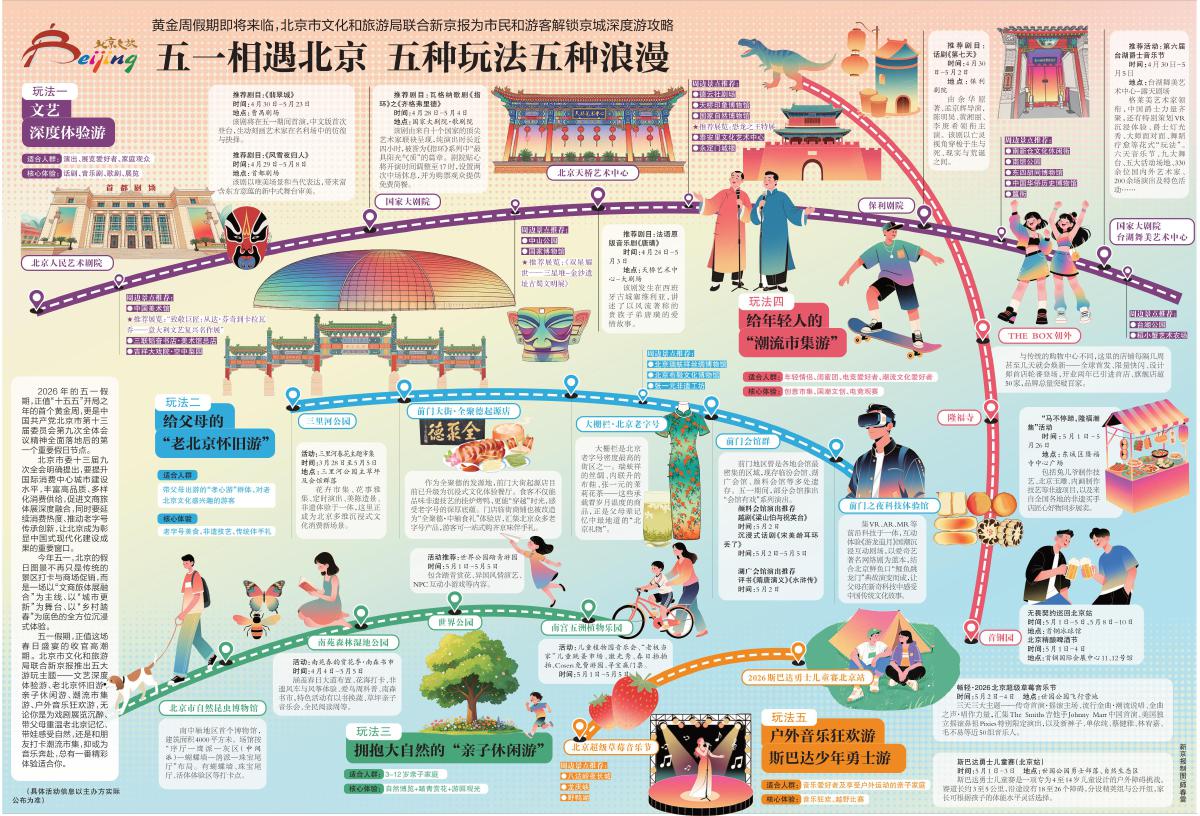 노동절 연휴는 이 봄 축제의 마무리 절정기다. 베이징시 문화와 관광국은 신경보와 협력하여 다섯 가지 주요 테마인 문예 심층 체험 여행, 올드 베이징 레트로 여행, 가족 여가 여행, 트렌드 시장 여행, 야외 음악 축제 여행을 선보인다. 당신이 연극 전시회에 심취하든, 부모님을 모시고 올드 베이징의 기억을 되새기든, 아이들을 데리고 자연을 느끼든, 친구들과 트렌드 시장을 방문하든, 음악을 위해 달려가든, 항상 멋진 경험이 당신에게 적합할 것이다.